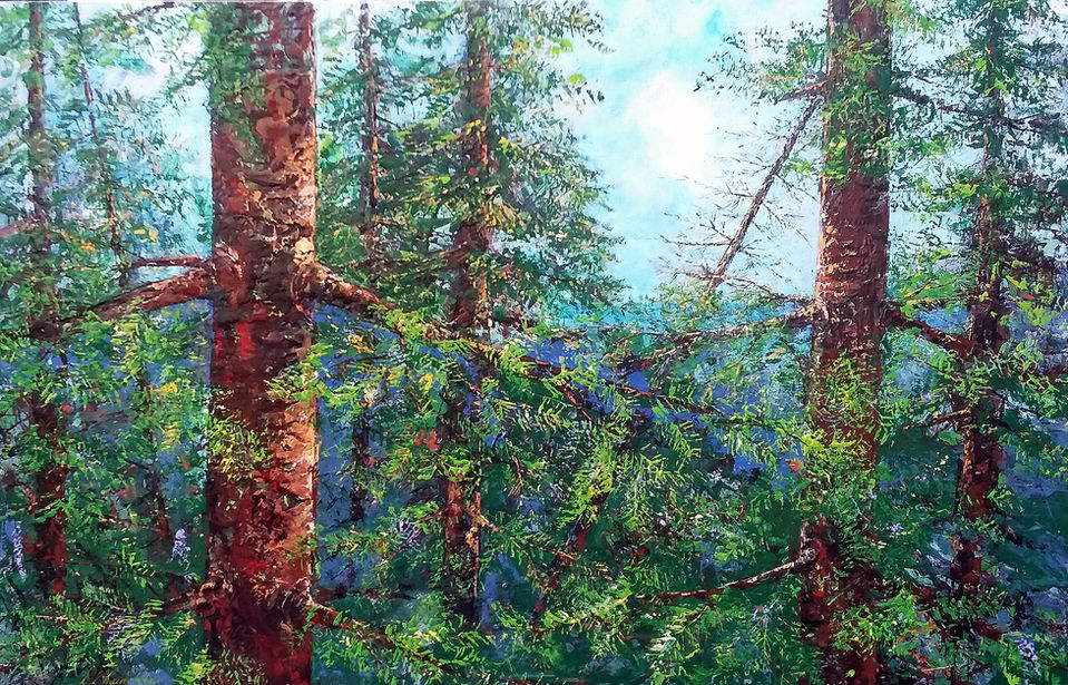 my work focuses on “treescapes” and wild botanical compositions and the never-ending inspiration provided by Maine and the New England landscape—I liken my paintings as orchestrations of visual music, much like jazz which is different from more formalized concepts of music. Invented as I proceed, each composition comes forward on a moment-by-moment basis, the components are random and abstract, yet consciously orchestrated—the growth of a living forest works in much the same way.